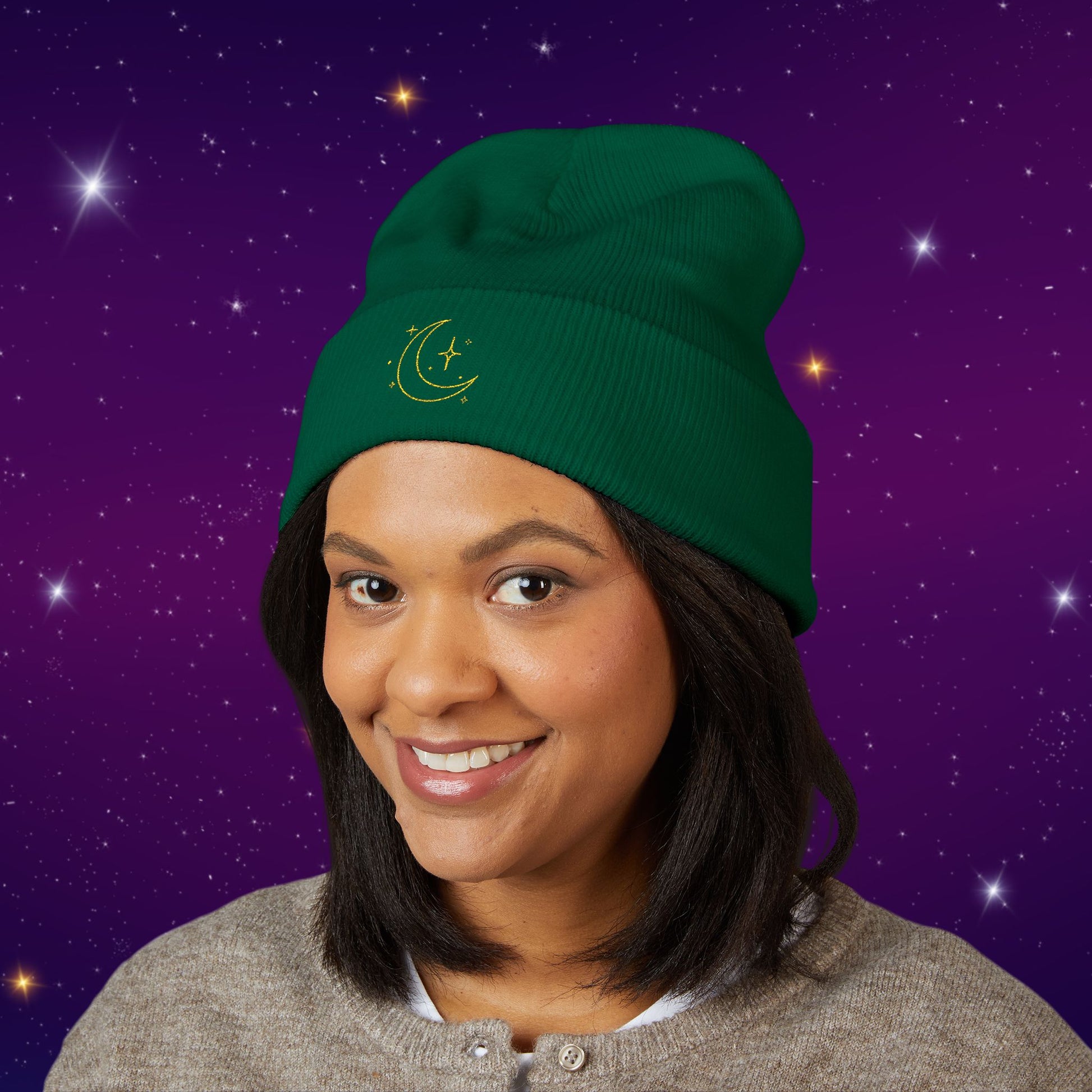 A soft, cuffed beanie embroidered with a delicate crescent moon and tiny stars. The deep green knit feels warm against the ears and sits comfortably with a generous 12" cuff that can be worn folded or slouched. Embroidered details add a subtle, handcrafted touch that reads personal rather than loud. Lightweight but insulating, it layers easily under a hood or pairs with a wool coat for clear-night walks, late-shift commutes, or quiet mornings at a neighborhood café. Designed for adults who like low-key, celestial-inspired accessories that age well and travel easily.