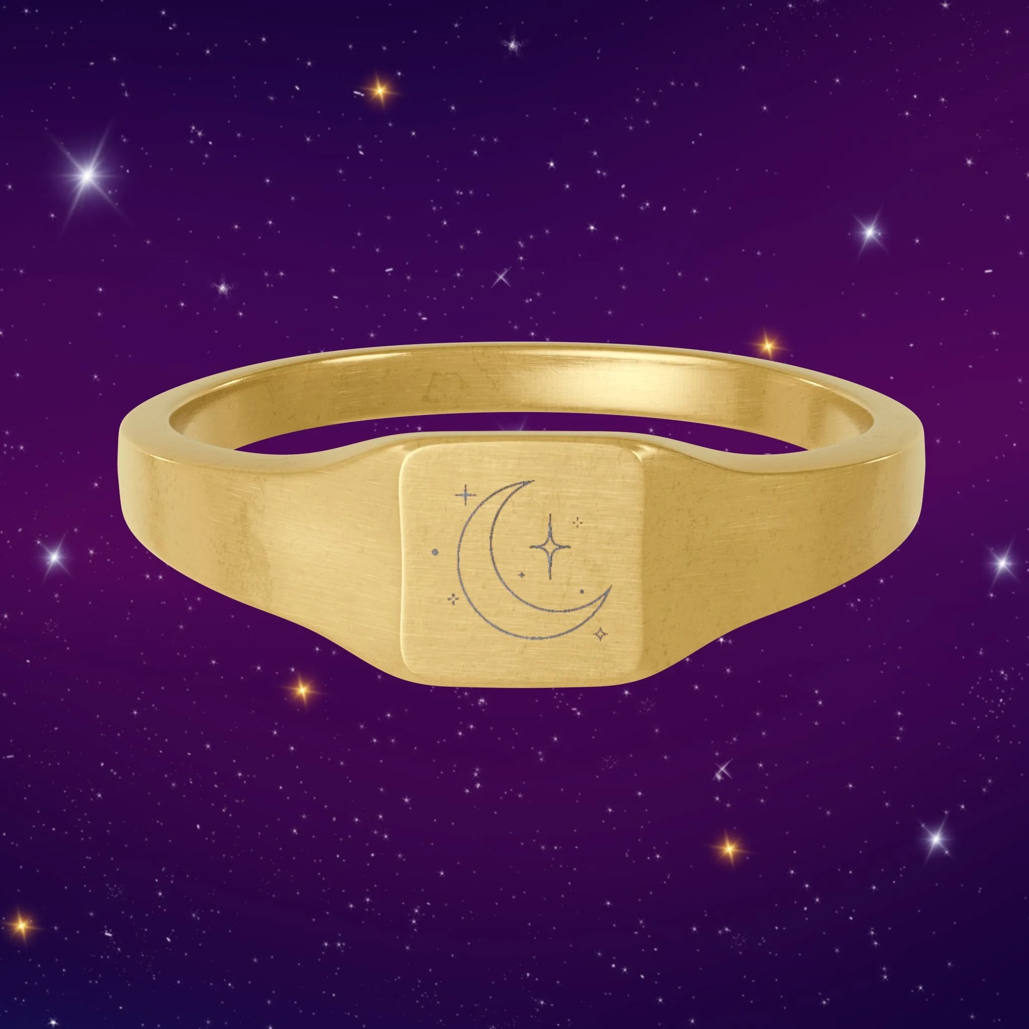 After Dark Origin Ring (Engravable Gold Square Signet Ring — Crescent Moon & Stars Stainless Steel)